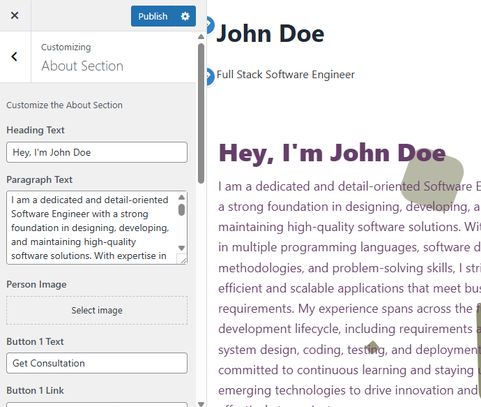 Use this section to introduce yourself professionally with a personalized heading, description, photo, and call-to-action buttons. You can also customize the background and text colors or add background images.